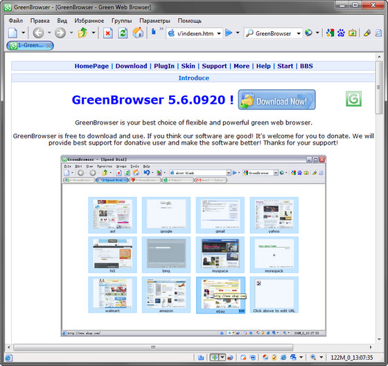 GreenBrowser - многовкладочный браузер на движке Internet Explorer с расширенными возможностями: URL-псевдонимы, URL-клавиши, жесты мыши, быстрая очистка кеша и куков, встроенный менеджер загрузок, кнопка быстрого выбора прокси, cборщик разных объектов (текста, рисунков, скриптов) и многое другое. Изображение зеленой буквы "G" в квадратике, появляющееся при запуске браузера, это не просто картинка, а многофункциональная кнопка, которую можно перетаскивать в любую часть экрана. При первом запуске браузера импортируются все закладки из Internet Explorer.