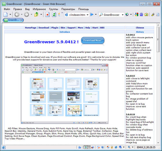 GreenBrowser - многовкладочный браузер на движке Internet Explorer с расширенными возможностями. Этот браузер позволяет открывать множество веб-страниц в одном окне, не загружая панель задач, оснащен встроенным поисковым механизмом, имеет фильтр, защищающий детей от попадания на разные непристойные сайты, распознает "мышиные жесты", записывает историю посещений сайтов и может открыть случайно захлопнутую страницу. Браузер имеет симпатичный изменяемый интерфейс, самостоятельно сохраняет список открытых страниц, дабы загрузить из при следующем запуске программы.