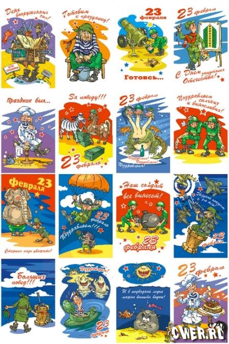 Набор прикольных открыток для поздравления мужчин с 23 февраля.