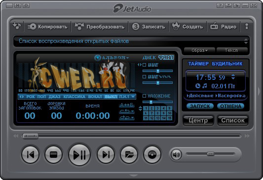 jetAudio - мощный мультимедийный центр. jetAudio является, пожалуй, самым навороченным и мощным из бесплатных мультимедийных центров - целая аудио/видеосистема. Умеет проигрывать MP3, MP2, WAV, MID, REAL AUDIO/VIDEO, S3M, MOD, MPG, AVI, MOV, Video/Audio CD, RealPlayer G2 и некоторые другие форматы мультимедийных файлов.