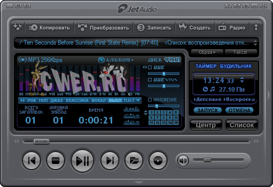jetAudio — это универсальный проигрыватель музыкальных и видео файлов, риппер, конвертер и т.д., в общем, все в одном комплекте. Программа поддерживает практически все музыкальные форматы, умеет проигрывать MP3, MP2, WAV, MID, REAL AUDIO/VIDEO, S3M, MOD, MPG, AVI, MOV, Video/Audio CD, RealPlayer G2 и некоторые другие форматы мультимедийных файлов. Позволяет записывать аудио компакт-диски или копировать их содержимое на жесткий диск ПК. Есть возможность накладывать на композиции различные эффекты, поддерживается синхронизация для караоке, имеется эквалайзер, конвертер форматов, редактор тэгов, кроссфейдинг, субтитры и т.д.