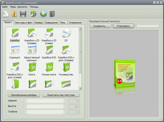 Cover Commander позволяет создавать профессиональные виртуальные коробки, книги, DVD-коробки, руководства, CD-диски, скриншоты. Всего несколько щелчков мыши все что нужно для выполнения этой работы. Исчерпывающие настройки освещения, камеры, тени, отражения позволяют вам создать изображение любого уровня сложности и увидеть готовый результат в реальном времени в окне предпросмотра. Мастер создания нового проекта выполнит всю "грязную" работу за вас, так что вы сможете сосредоточиться на содержании вашего проекта.