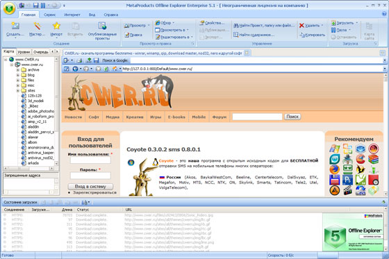 MetaProducts Offline Explorer - оффлайн браузер, поддерживающий работу как с обычными Web сайтами, так и с FTP, защищенными (HTTPS) серверами, потоковыми видео/аудио приложениями (MMS, RTSP в профессиональной версии). Встроенные средства обеспечивают комфортную работу с закачанными узлами. Есть планировщик, экспорт, импорт, встроенный браузер и много дополнительных инструментов.Мощные средства настройки позволяют закачивать даже самые сложные сайты. Производится обработка скриптов, классов Java, Flash апплетов, PDF, ASX, RAM, XML/XSL, CSS, TOC, M3U, RPM, AAM файлов.