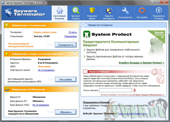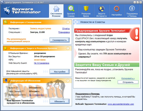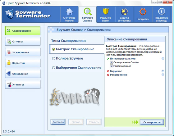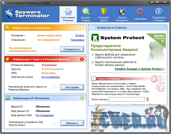 Spyware Terminator – мощный adware и spyware сканер с защитой в реальном времени, который может обнаруживать, удалять или изолировать spyware, adware, Троянов, кейлоггеров, похитителей персональных данных и другие возможные угрозы. Сканирование может быть настроено по желанию пользователя. В состав Spyware Terminator входит планировщик, а также защита в реальном времени для вашего браузера, хост-файлов, данных автозапуска и других системных областей.