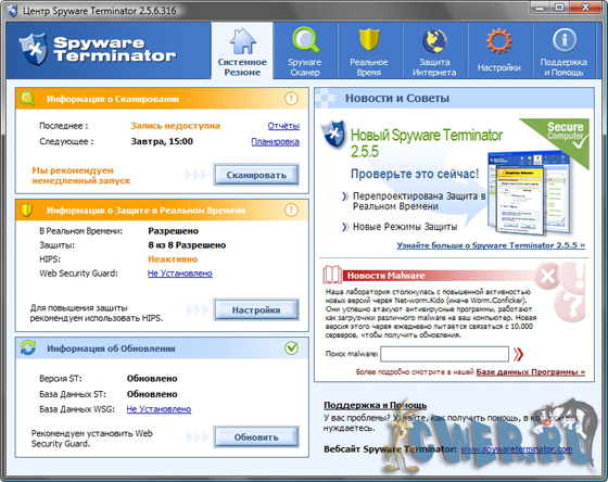 Spyware Terminator - программа для защиты компьютера от различных вредных модулей - spyware, adware, кейлоггеров и других троянов. Имеет резидентный монитор, который в реальном времени проводит мониторинг системы и предотвращает попытки проникновения на компьютер вредоносного ПО. Кроме этого, имеющийся в программе сканер поможет отыскать и поместить в "карантин" или удалить уже внедренные объекты. Работает программа очень быстро... Spyware Terminator имеет опцию автоматического обновления своих баз через Интернет, а также умеет производить проверку по расписанию.