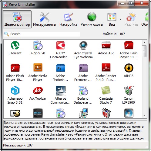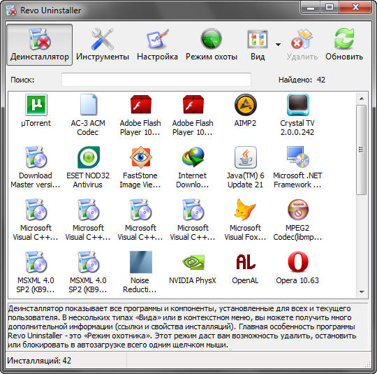 Revo Uninstaller - бесплатная утилита, которая является не просто очередным аналогом стандартного апплета "Установка и удаление программ" операционных систем Windows, а объединяет в себе достаточное количество полезных модулей и компонент для выполнения полномасштабной очистки компьютера. Revo Uninstaller работает эффективнее стандартных средств Windows, благодаря тому, что до и после деинсталляции проводит сканирование системы, обнаруживая и удаляя все внесенные удаляемой программой изменения (файлы, папки, ключи реестра).