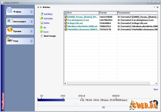 Программа для записи CD/DVD дисков. Несмотря на то, что программа бесплатна и имеет относительно маленький размер, в ней есть все функции, необходимые рядовому пользователю. С помощью FinalBurner можно записать диск с данными, создать CD-аудио и DVD-видео диски, а также сделать ISO-образ диска. Для записи CD-аудио подходят многие музыкальные форматы (WAV, MP3, OGG, WMA, MID и т.д.), которые свободно импортируются при добавлении их в проект. Не менее полезной возможностью является импортирование видео файлов (AVI, MPEG4, MP4, MPG, WMV, ASF, MOV) для создания своих DVD-видео дисков.