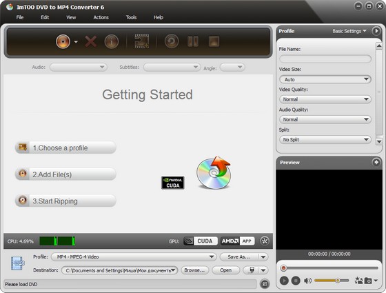 ImTOO DVD to MP4 Converter - конвертер из DVD в MPEG-4, MP4, DivX видео форматы. Поддерживает извлечение аудио из видео DVD в MP3, AAC, M4A форматы, нормализацию звука, выбор уровня громкости, выбор и настройку параметров сохранения, автоматическую нарезку на фрагменты, выбор файлов на DVD для последующего извлечения и конвертирования, предварительный просмотр видео. Достоинства программы: высокое качество и удобство в работе, простой и удобный интерфейс.