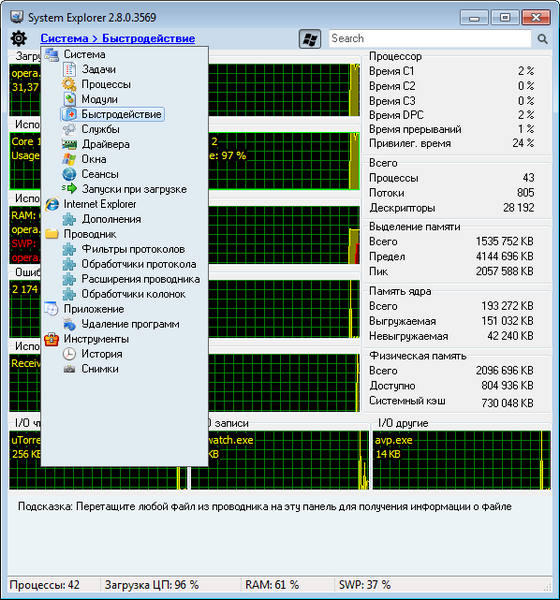 System Explorer - диспетчер задач для Windows. Функциональная, небольшая утилита, способная полностью заменить стандартный диспетчер задач. В System Explorer все строго структурировано и разложено по полочкам. Каждый раздел включает в себя подраздел, в котором и происходят основные манипуляции.