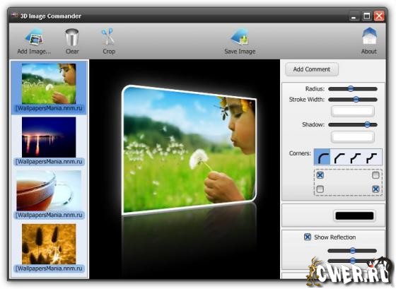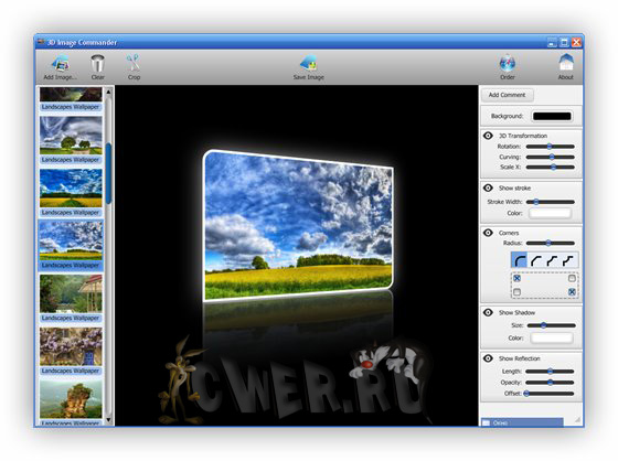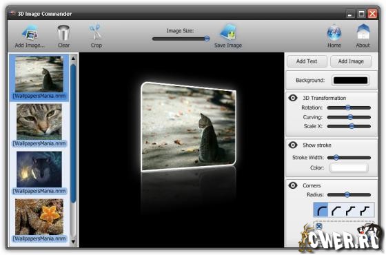 3D Image Commander - это полнофункциональная программа, которая позволит вам создавать непревзойденные эскизы страниц с различными 3D стилями и эффектами. Вы также сможете накладывать водяные знаки на ваши творения. Создавайте изображения с такими эффектами, как трехмерная перспектива и трехмерная кривая, отражение, свечение, уголки и мазки. Программа поддерживает такие форматы, как BMP, JPG, GIF, PNG, TIFF и PSD.