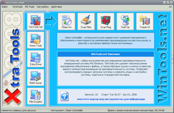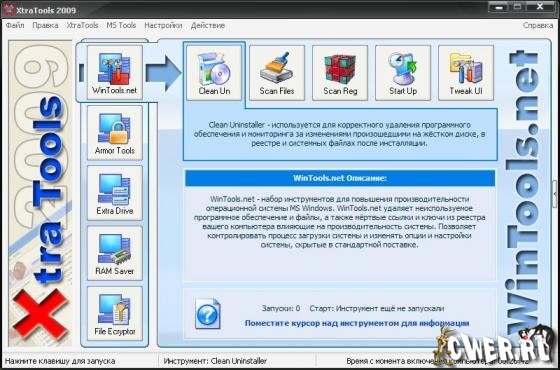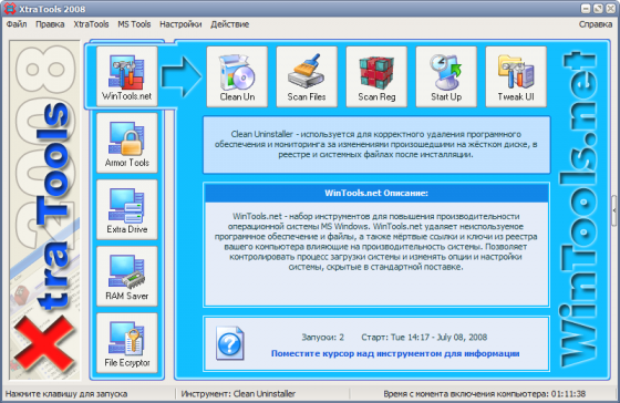 XtraTools - пакет программного обеспечения содержащий более двадцати отдельных системных утилит. XtraTools увеличивает производительность операционной системы и делает работу с MS Windows более легкой. XtraTools содержит WinTools.net, Armor Tools, Extra Drive Creator Pro, RAM Saver Pro и др.