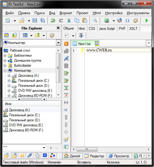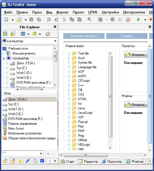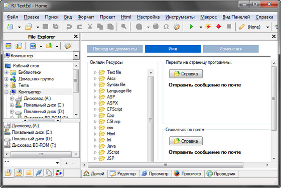 RJ TextEd - юникодный редактор со множеством возможностей для редактирования текста, html-документов, java-скриптов и т.д. Открытие множества документов в многовкладочном окне, подсветка и проверка синтаксиса, подсказки при вводе кода, закладки, неограниченное undo/redo, редактор css, html-превью, встроенный ftp-клиент, поддержка email, поддержка drag'n'drop, поддержка скинов и многое другое.