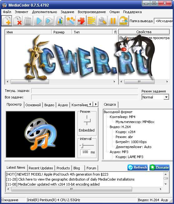 MediaCoder - позволяет повысить компрессию видео и аудио с целью уменьшения размеров файла, может извлекать аудиотреки, предоставляет возможности для конвертирования видео в нормальные VCD/DVD, может осуществлять конвертирование аудио без заметной потери качества, способен создавать копии CD "на лету" и многое другое.
