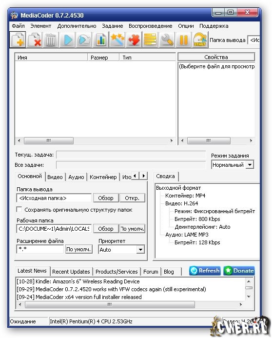 MediaCoder - позволяет повысить компрессию видео и аудио с целью уменьшения размеров файла, может извлекать аудиотреки, предоставляет возможности для конвертирования видео в нормальные VCD/DVD, может осуществлять конвертирование аудио без заметной потери качества, способен создавать копии CD "на лету" и многое другое.