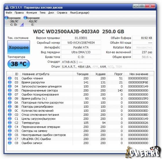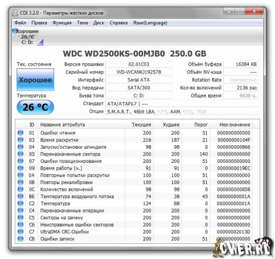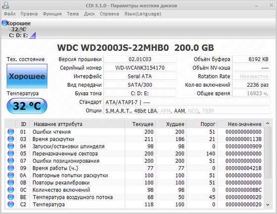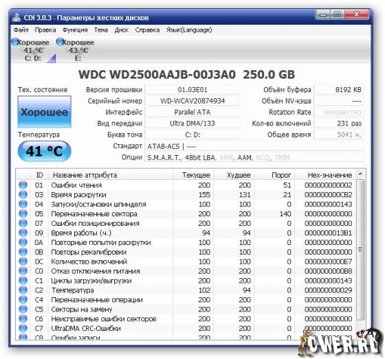 CrystalDiskInfo - отслеживает состояние жестких дисков, поддерживающих технологию S.M.A.R.T. Производит мониторинг и дает общую оценку "здоровья" вашего диска. Так же отображает детальную информацию о жестких дисках, установленных в компьютере (прошивка, серийный номер, стандарт, интерфейс, общее время работы и др.), а также выводит параметры атрибутов системы самодиагностики S.M.A.R.T. (ошибки чтения, производительность, запуски/остановки шпинделя, время поиска дорожки, количество циклов включения-выключения, ошибки секторов и многое другое).