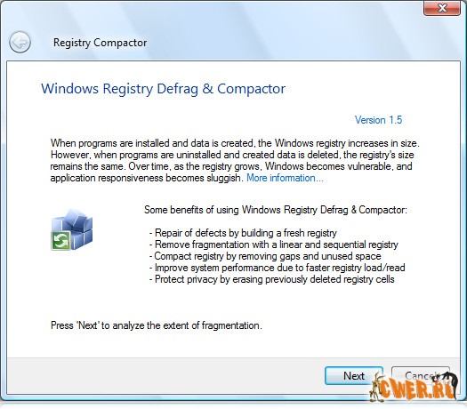 При добавлении в реестр Windows новых данных он растет день ото дня, и напротив, совсем не уменьшается при удалении их. Раздутый реестр способен существенно замедлить время загрузки системы и значительно снизить ее производительность. Данная утилита позволяет сжимать, реконструировать и переиндексировать ваш реестр для уменьшения ошибок, всего в несколько шагов.