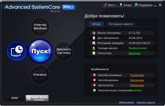 Advanced SystemCare Pro - программа, включающая в себя множество модулей для оптимизации, настройки и повышения производительности компьютеров, находящихся под управлением операционными системами Windows 2000/XP/Vista/7. Благодаря возможностям программы вы сможете очистить ПК от шпионского и рекламного ПО, обнаружить и заранее устранить возможные угрозы и бреши в системе безопасности ОС, исправить ошибки в системном реестре, очистить временные и ненужные файлы, управлять списками автозагрузок, оптимизировать работу систем.