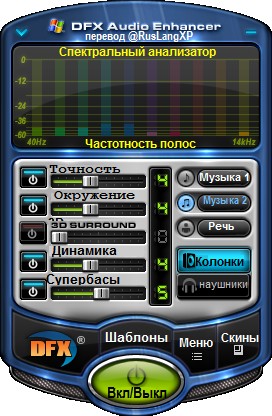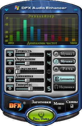 DFX Audio Enhancer - плагин для улучшения качества звучания плееров Winamp, Windows Media Player, MusicMatch JukeBox, Musicmatch, RealPlayer, J. River Media Center, Yahoo! Music Jukebox. C помощью DFX устраняются два главных недостатка - срез высоких частот и недостаточное разделение стереобазы и ее глубины. Есть хорошая подборка заранее заготовленных настроек, то есть пресетов. Проще его можно назвать как модный расширенный эквалайзер, с настройками, которых нет в плеерах.
