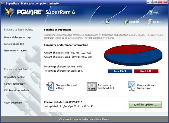 SuperRam - инструмент для оптимизации и управления компьютерной памятью. Работать с программой просто - с ней справится даже человек, никогда раньше не работавший с подобными утилитами. Вам будет достаточно выбрать объем памяти, который будет использоваться, и объем, который следует освободить, после чего нажать кнопку "ОК". Остальное сделает программа.