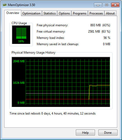Memory Improve Professional позволяет увеличить быстродействие вашей системы за счет освобождения и дефрагментации оперативной памяти. Имеется возможность установки минимального количество свободной оперативной памяти, при превышении которого запустится модуль и попытается удалить из оперативной памяти лишние процессы, имеется возможность возможность просмотра запущенных процессов, наблюдение за нагрузкой на ЦП и множество других полезных настроек.
