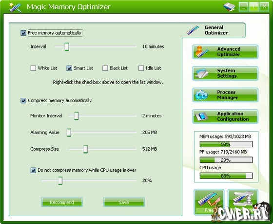 Magic Memory Optimizer - предназначена для решения трудных и критических проблем возникающих в оперативной памяти компьютера. Память - самый драгоценный ресурс на вашем компьютере; если ее становится недостаточно, ваш компьютер начинает медленно работать, "зависать" или наступает крах, - падение системы. Сама же Windows не управляет памятью на должном уровне. Со временем, не имеет значения какой объем памяти у вас имеется, Windows постепенно для своей работы и прикладных программ отбирает остатки свободной памяти, что легко может привести вашу систему к краху. Magic Memory Optimizer решит все эти проблемы, высвобождая и восстанавливая беспечно растраченную системой память для ваших программ.