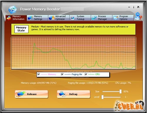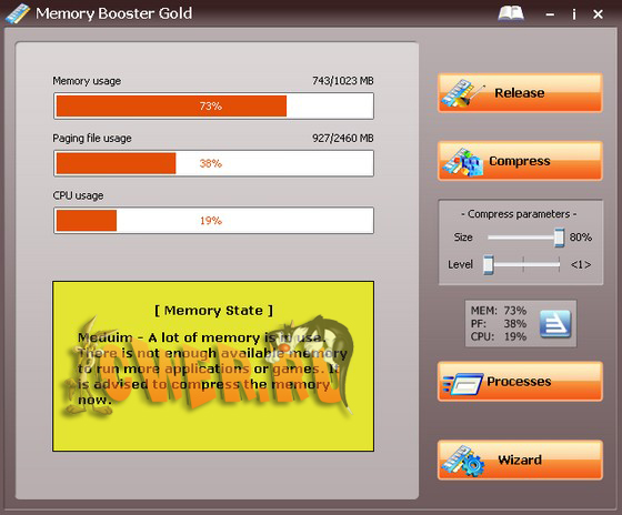 Memory Booster Gold - легкая в использовании утилита для мониторинга и управления системной памятью компьютера. Позволяет уменьшать время загрузки и улучшать производительность приложений, запускаемых в вашей системе. Программа является средством для решения различных проблем с оперативной памятью компьютера. Это богатая возможностями и легкая в использовании программа. Оперативная память является одним из самых главных объектов в компьютере и, если производительность памяти становится низкой, то это может приводить к частым зависаниям системы или уменьшению скорости работы компьютера. Если вы хотите улучшить производительность вашего компьютера или хотите избавится от фрагментации, собранной в вашей системе, то данная программа будет вам очень полезна.