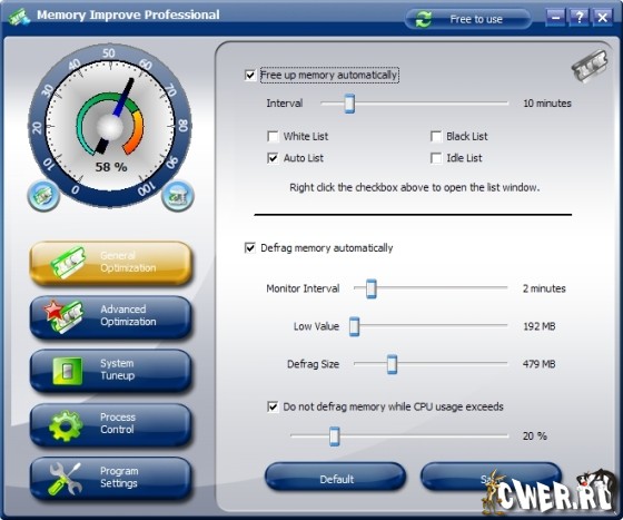 Memory Improve Master – позволяет увеличить быстродействие вашего компьютера за счет освобождения (дефрагментации) оперативной памяти. Имеется возможность установки минимального количество свободной оперативной памяти, при превышении которого запустится модуль и попытается удалить из оперативной памяти лишние процессы. Кроме этого, есть возможность просмотра запущенных процессов, наблюдение за нагрузкой на ЦП и множество других полезных настроек.