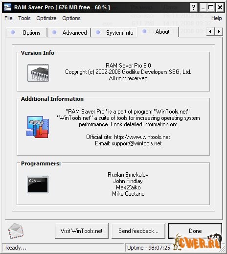 RAM Saver Pro - инструмент для профессионального мониторинга, очистки и оптимизации оперативной памяти. Служит для повышения производительности операционной системы, освобождая оперативную память от драйверов и процессов Windows для приложений, требующих максимальную загрузку процессора и оперативной памяти. RAM Saver Pro дефрагментирует системную память для быстрого доступа к ней, улучшает эффективность работы процессора и кэша памяти, восстанавливает утечку памяти в плохо оптимизированных приложениях, временно помещает не используемые библиотеки и драйверы в swap-файл, освобождая RAM.