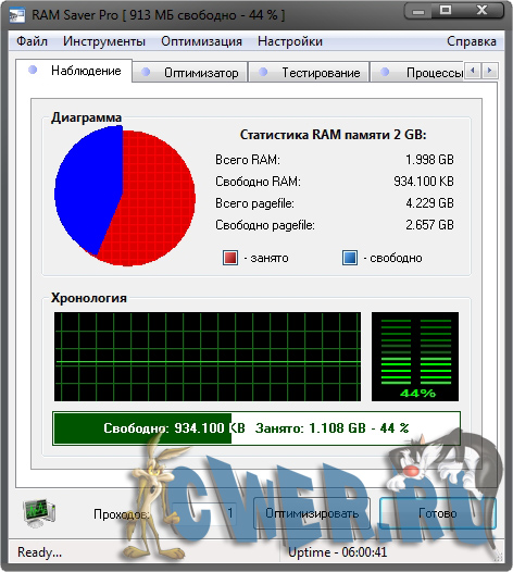 Oчищает, освобождает и оптимизирует ОЗУ вашего персонального компьютера, давая ему работать быстрее и максимально эффективно. Она непрестанно проверяет оперативную память компьютера, и как только количество свободной оперативной памяти уменьшается, она завершает ненужные процессы, увеличивая быстродействие.