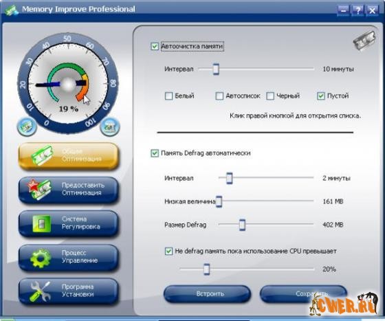 Memory Improve Master – позволяет увеличить быстродействие вашего компьютера за счет освобождения (дефрагментации) оперативной памяти. Имеется возможность установки минимального количество свободной оперативной памяти, при превышении которого запустится модуль и попытается удалить из оперативной памяти лишние процессы. Кроме этого, есть возможность просмотра запущенных процессов, наблюдение за нагрузкой на ЦП и множество других полезных настроек.