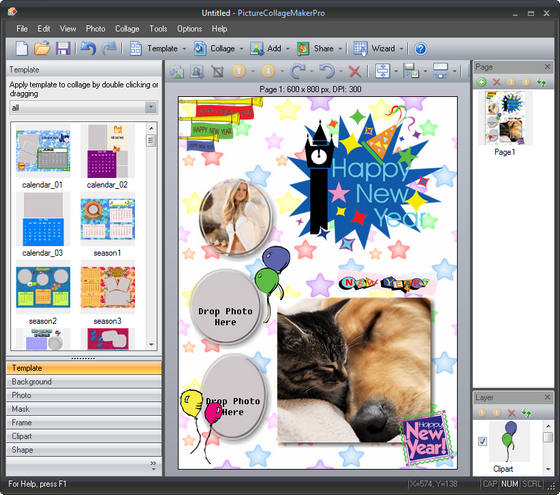 Picture Collage Maker - простая в использовании программа для создания коллажей из ваших фотографий. Простой интерфейс программы и множество шаблонов позволят легко создавать разнообразные фотоколлажи (календари, поздравительные открытки, пригласительные билеты, постеры и т.д.) даже неопытным пользователям. Создание коллажей - это расслабляющее время-провождение, помогающее превращать собранные фотографии в драгоценные воспоминания. Это самый легкий способ создания коллажей с применением вращений, изменения размеров, положений, обрамлений, маскировки, слияния и применением различных эффектов для каждой картинки по-отдельности. Результат может быть сохранен в форматах JPG, BMP, TIFF, GIF, WMF, TGA, PNG или установлен в качестве фонового рисунка для рабочего стола.