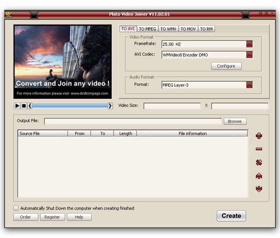 Plato Video Joiner - способна соединять несколько различных типов видео файлов в один большой, типа AVI/DIVX, MPEG, WMV/ASF, RM/RMVB, или MOV. Поддерживает все популярные видео форматы, включая AVI, DivX, XviD, MPEG, WMV, MOV в AVI, MPEG4, DivX, XviD, MPEG1, MPEG2, WMV, RealMedia видео форматы. Вы можете добавлять неограниченное количество видео файлов в список и легко изменить их порядок, при необходимости.
