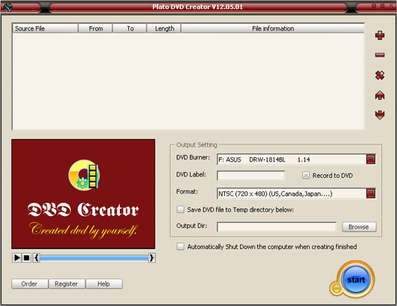 Plato DVD Creator - является легко используемым приложением для создания фильмов DVD. Поддерживает большинство популярных видеоформатов, таких как DivX, XviD, AVI, MOV. С помощью этой программы вы можете легко объединить до 4 часов видео и записать их в стандартном MPEG2 формате на DVD/RW диск, воспроизводимом на любом DVD плеере, при этом скорость конвертирования будет более чем в 2 раза выше скорости воспроизведения.