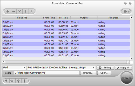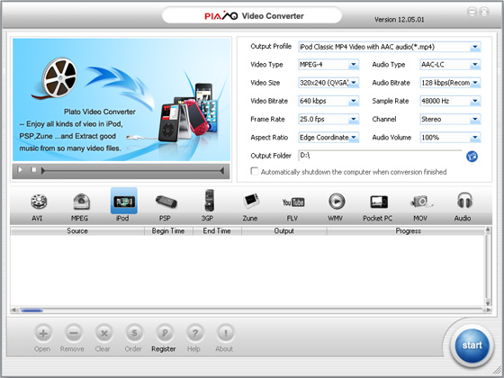 Plato Video To iPod Converter - программа для конвертирования видео в формат iPod, PSP, 3GP для просмотра на iPod, PSP (sony playstation portable), мобильных телефонах, Xbox, КПК, PMP. Способен работать почти со всеми форматами: rm, divx, xvid, avi, wmv, asf, mpg, mpeg, vob, mov, qt, vcd, svcd, Apple iPod MP4, Sony PSP MP4, 3GP, X-box MPEG2, PMP, PDA, SD Video ASF, AVI, MPG, MPEG, ASF, MOV, AMR, FLV, FLIC, SWF и другие.