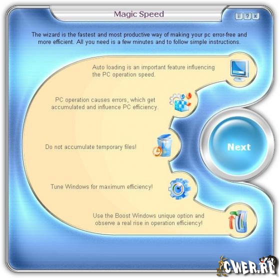 Magic Speed - программа для оптимизации работы операционной системы и очистки её от ненужных данных. В ней присутствуют средства для поиска и исправления ошибок в реестре Windows, проведения очистки системы от скопившихся временных файлов и включения некоторых опций операционной системы, повышающих её быстродействие. Magic Speed может анализировать автоматически запускаемые приложения, позволяя отключать загрузку неиспользуемых программ, а встроенный антивирусный движок поможет выявить среди них шпионские модули и другие вредоносные процессы. Кроме того, здесь имеются инструменты для дефрагментации оперативной памяти и ускорения загрузки системы. Для работы с приложением не требуется глубоких знаний ПК, все действия осуществляются с помощью пошагового Мастера оптимизации, все что от вас требуется, это 5 кликов мышкой.