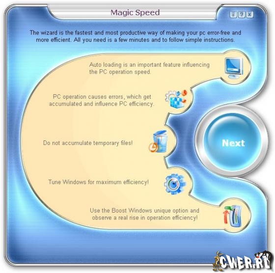 Magic Speed - программа для оптимизации работы операционной системы и очистки её от ненужных данных. В ней присутствуют средства для поиска и исправления ошибок в реестре Windows, проведения очистки системы от скопившихся временных файлов и включения некоторых опций операционной системы, повышающих её быстродействие. Magic Speed может анализировать автоматически запускаемые приложения, позволяя отключать загрузку неиспользуемых программ, а встроенный антивирусный движок поможет выявить среди них шпионские модули и другие вредоносные процессы. Кроме того, здесь имеются инструменты для дефрагментации оперативной памяти и ускорения загрузки системы. Для работы с приложением не требуется глубоких знаний ПК, все действия осуществляются с помощью пошагового Мастера оптимизации.
