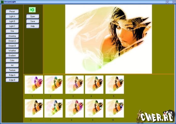 DreamLight Photo Editor - программа, с помощью которой можно добавлять к цифровым фотографиям различные спецэффекты. DreamLight Photo Editor содержит 15 различных фильтров, у каждого фильтра есть по 10 различных эффектов, причем, на одну фотографию можно накладывать сразу несколько фильтров. Среди добавляемых эффектов есть такие, как: различные световые фильтры, звезды, специальные фильтры, делающие снимки очень впечатляющими и мечтательными.