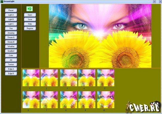 C помощью этой программы можно добавлять к цифровым фотографиям различные спецэффекты. DreamLight Photo Editor содержит 15 различных фильтров, у каждого фильтра есть по 10 различных эффектов, причем, на одну фотографию можно накладывать сразу несколько фильтров. Среди добавляемых эффектов есть такие, как: звезды, специальные фильтры, делающие снимки очень впечатляющими и мечтательными.