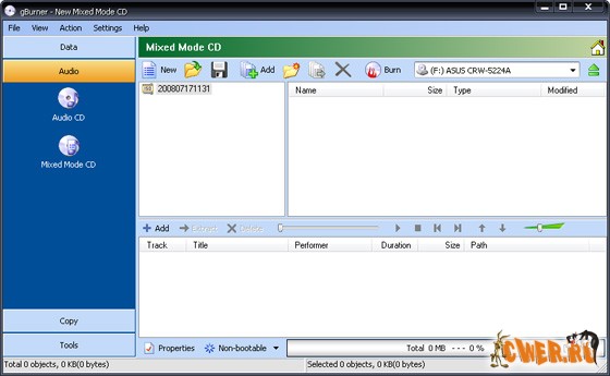 gBurner - это мощная но легкая в использовании программа, которая позволяет создавать и прожигать data/audio, bootable и multisession CD и DVD диски. gBurner позволяет также открывать, создавать, извлекать, редактировать, конвертировать и прожигать ISO/BIN образы.
