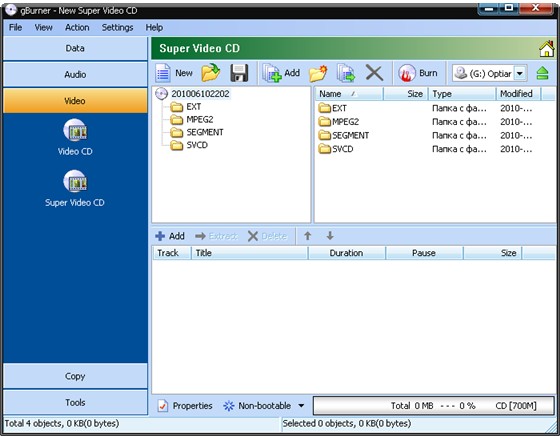 gBurner - это мощная, но легкая в использовании программа, которая позволяет создавать и прожигать data/audio, bootable и multisession CD и DVD-диски. Программа позволяет также открывать, создавать, извлекать, редактировать, конвертировать и прожигать ISO/BIN-образы.