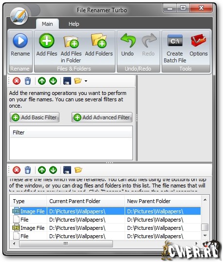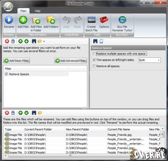 File Renamer Turbo - программа для пакетного переименования файлов. Способна одновременно переименовывать тысячи файлов и папок, а также содержит более 20 специализированных фильтров, значительно упрощающих данный процесс. Также с ее помощью можно редактировать тэги музыкальных файлов MP3, OGG, WMA, M4A, APE, FLAC и MPC. Программа в автоматическом режиме позволяет получать информацию с сайта MusicBrainz.org и заполнять тэги.