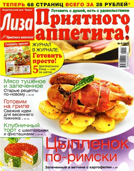 "Лиза. Приятного аппетита!" — журнал для тех, кто любит готовить, печь и радовать близких кулинарными сюрпризами. Издание предлагает яркий аппетитный мир всем, для кого готовить — радость, а есть — удовольствие. Это журнал, целиком посвященный только одной теме — домашней кулинарии.