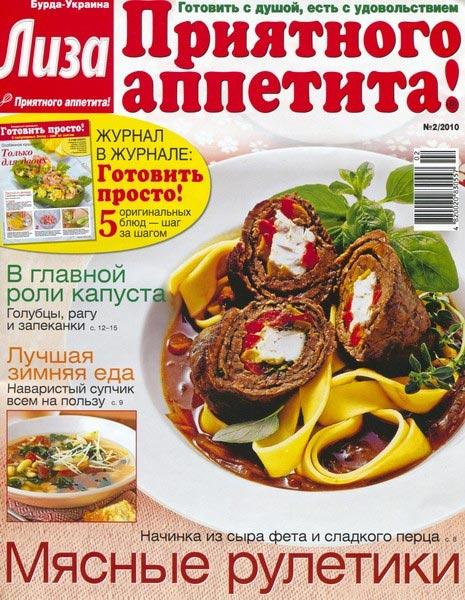 Журнал для тех, кто любит готовить, печь и радовать близких кулинарными сюрпризами. Издание предлагает яркий аппетитный мир всем, для кого готовить — радость, а есть — удовольствие. Это журнал, целиком посвященный только одной теме — домашней кулинарии. На страницах издания — лучшие рецепты русской кухни и самое вкусное со всего света, советы по приготовлению традиционных и экзотических блюд. Эффектный и несложный в исполнении, любой рецепт журнала может стать «фирменным» для любителя готовить дома. В журнале «Лиза. Приятного аппетита!» — рецепты от звезд, обеды для всей семьи, новинки из магазинов, аппетитные новости, школа поварят.