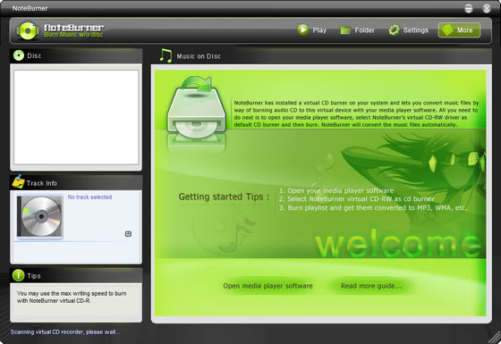 NoteBurner ─ конвертер аудиофайлов, способный освобождать аудиофайлы от защиты DRM, которая ограничивает права воспроизведения музыки на компьютерах и портативных устройствах. Поддерживает работу с форматами WMA, M4P, AA, M4B, MP4 и может преобразовывать их в незащищенные файлы MP3, WAV и WMA. Для конвертирования используется виртуальное устройство CD-RW, которое добавляется в систему после установки программы. Созданные аудиофайлы содержат те же ID3-теги что и исходные файлы, в том числе название песни и альбома, имя исполнителя и т.д.