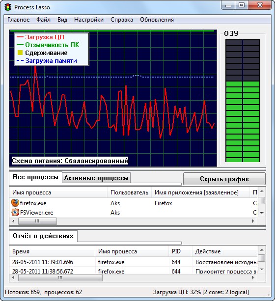Windows, по умолчанию, позволяет программам полностью загружать центральный процессор, что ведет к зависанию системы и, соответственно, к неудобству работы. Технология ProBalance (Process Balance) программы Process Lasso аккуратно перераспределяет приоритеты запущенных программ, так что процессы, которые ранее загружали весь центральный процессор, больше не будут влиять на отклик системы.