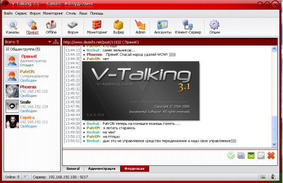 V-Talking - многофункциональный чат и форум для локальных сетей с мониторингом сетевых подключений и шифрованием сообщений. V-Talking может работать как в клиент-серверном режиме, так и в режиме клиент-клиент. Поддерживается администрирование, отложенные сообщения, передача файлов, система репутации, информация о пользователях, сетевое окружение, аккаунты, аватары, скины и многое другое.