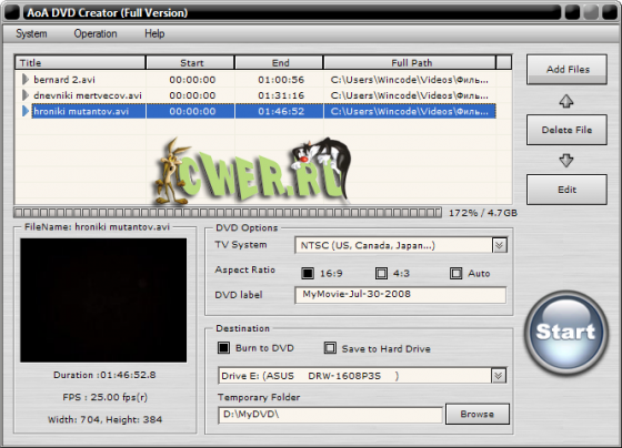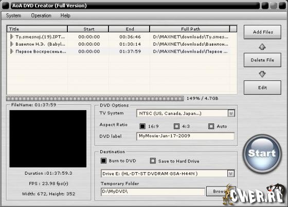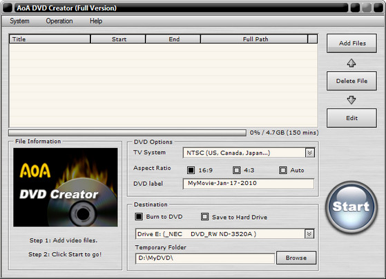 AoA DVD Creator - программа предназначена для создания DVD фильмов из обычных видеофайлов. Обеспечит Вам удобство в создании или преобразовании AVI, WMV/ASF, FLV (Flash Video), MP4, 3GP, MPEG/MPG, DAT и MOV в DVD, которые Вы можете смотреть на вашем домашнем DVD плеере. С AoA DVD Creator, Вы сможете легко превратить каникулы, свадьбу и семейные кинофильмы в DVD диски, которые потом можно просматривать вместе с вашими друзьями и семьей!