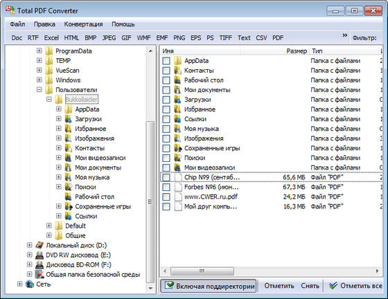 Total PDF Converter преобразовывает PDF в Doc, Excel, HTML, Text, CSV или изображения (TIFF, JPEG). Преимущество этой утилиты в том, что Total PDF Сonverter преобразовывает как отдельный файл, так и множество PDF файлов одновременно. Вам больше не нужен дорогой Adobe Acrobat, наш конвертер сэкономит Ваши деньги. Зарегистрированные пользователи получают командную строку для более эффективной работы с утилитой.