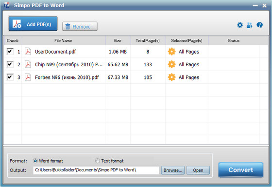 Simpo PDF to Word позволяет конвертировать файлы формата PDF в текстовый формат DOC или DOCX, с полным сохранением форматирования исходного документа. Программа также представляет возможность выбора типа конечного файла: только текст или текст с изображениями.