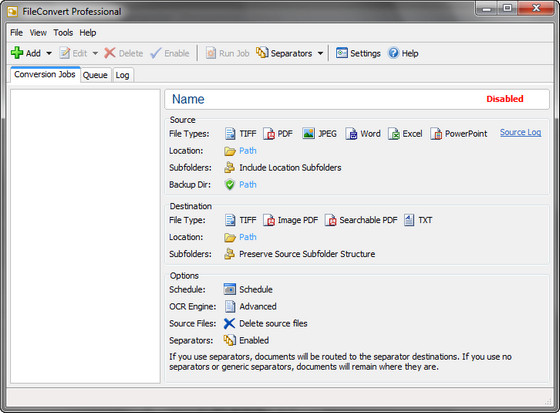 FileConvert программа для конвертирования различных файлов в PDF документы в пакетном режиме. С помощью этой программы вы сможете преобразовать существующие файлы, такие как: сканы документов, факсы и документы Word в PDF форматы с возможностью текстового поиска. Программа будет следить за новыми сканами с сетевого сканера или сканировать существующие файлы в PDF. Для этого вам нужно создать новое задание, в котором вы указываете путь до папки приходящих со сканера изображений в формате TIFF, указываете папку для сохранения преобразованных файлов, промежуток времени, через который программа должна проверять исходящую папку на наличие новых сканов (можно установить ручную проверку) и все. FileConvert был специально разработан для небольших офисов, в составе которых нет выделенного для таких задач ИТ-персонала.